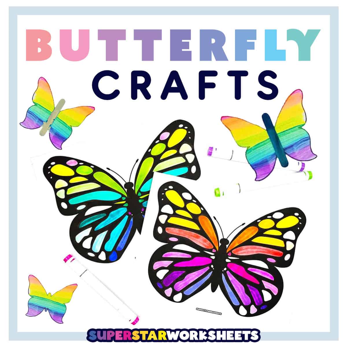 We’ve created a huge variety of butterfly coloring pages, butterfly templates, and even this stunning butterfly coloring craft. Students of all ages can use these free printables to create a variety of crafts and art projects featuring these beautiful spring insects.