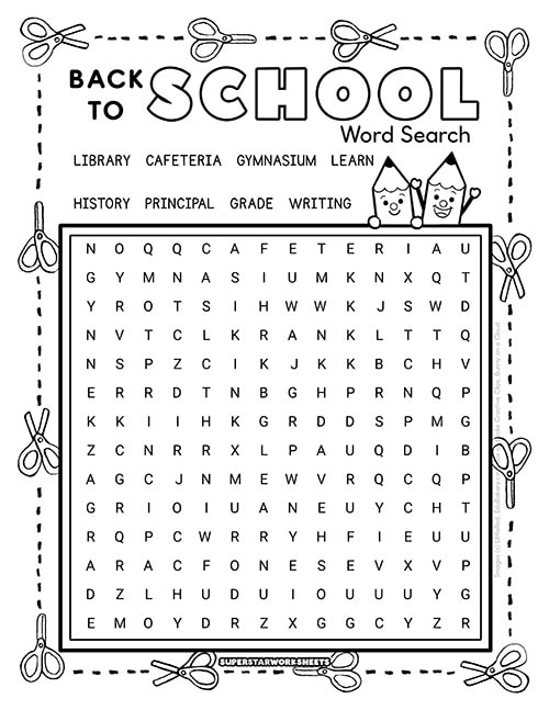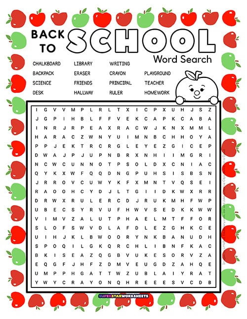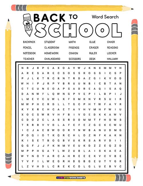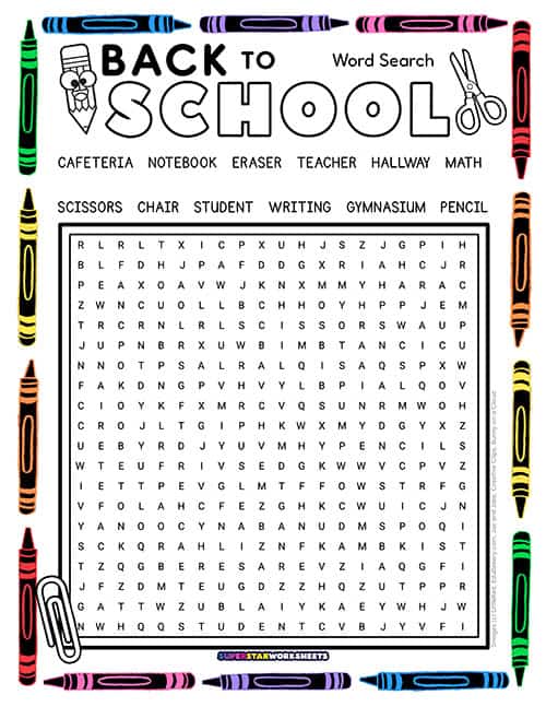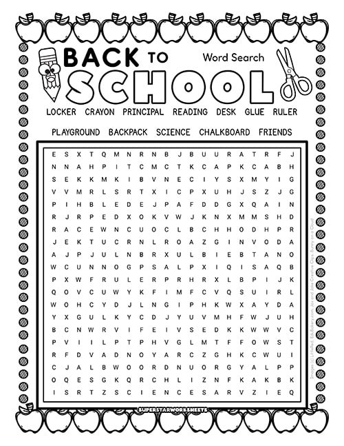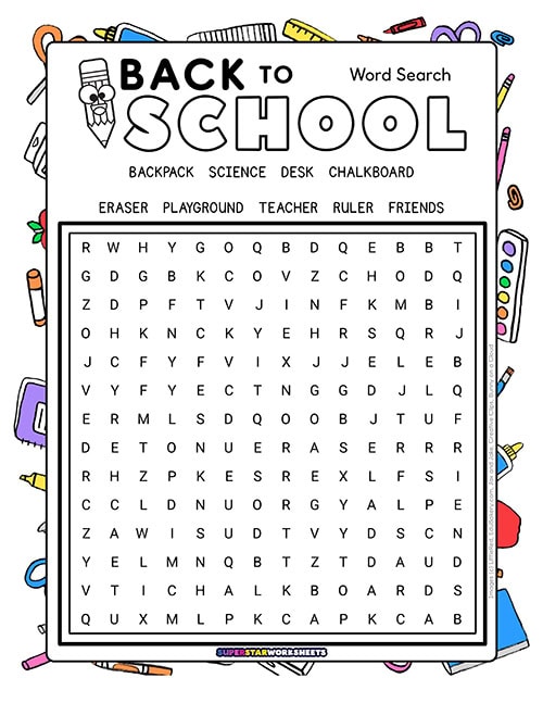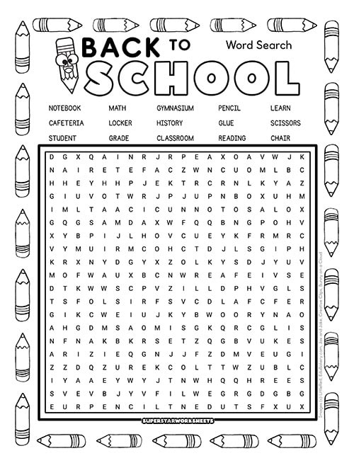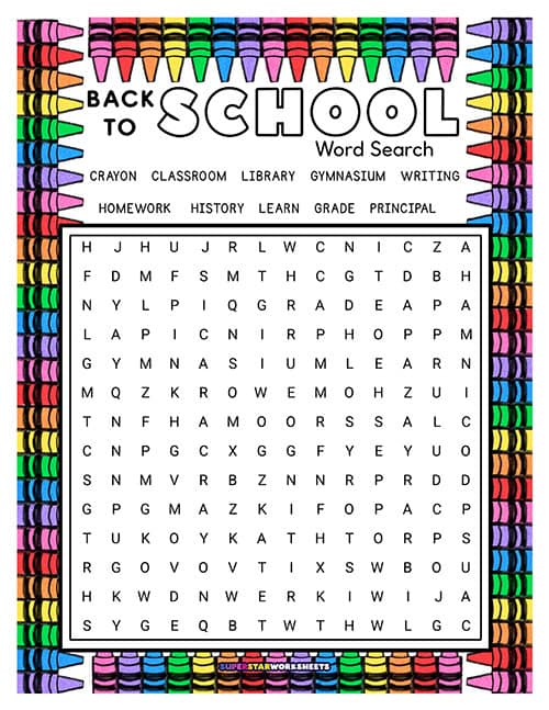 Students will find school-related words, subjects, and activities with this free back to school word search printable PDF. A great challenge for upper elementary students!