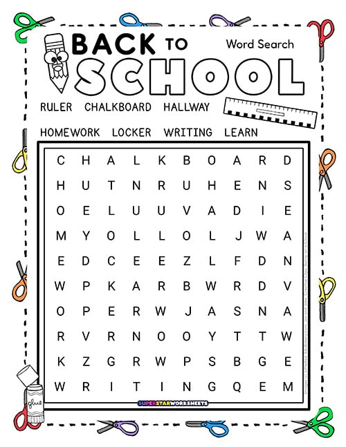 Word List: backpack, pencil, crayon, scissors, glue, eraser, ruler, notebook, teacher, student, classroom, desk, chair, chalkboard, locker, hallway, cafeteria, playground, gymnasium, homework, reading, writing, math, science, history, friends, learn, grade, principal, and library.