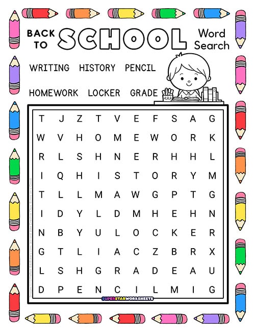 This free back to school word search printable makes a great homework assignment, allowing kids to practice school vocabulary in a fun way. Includes seven words to find!