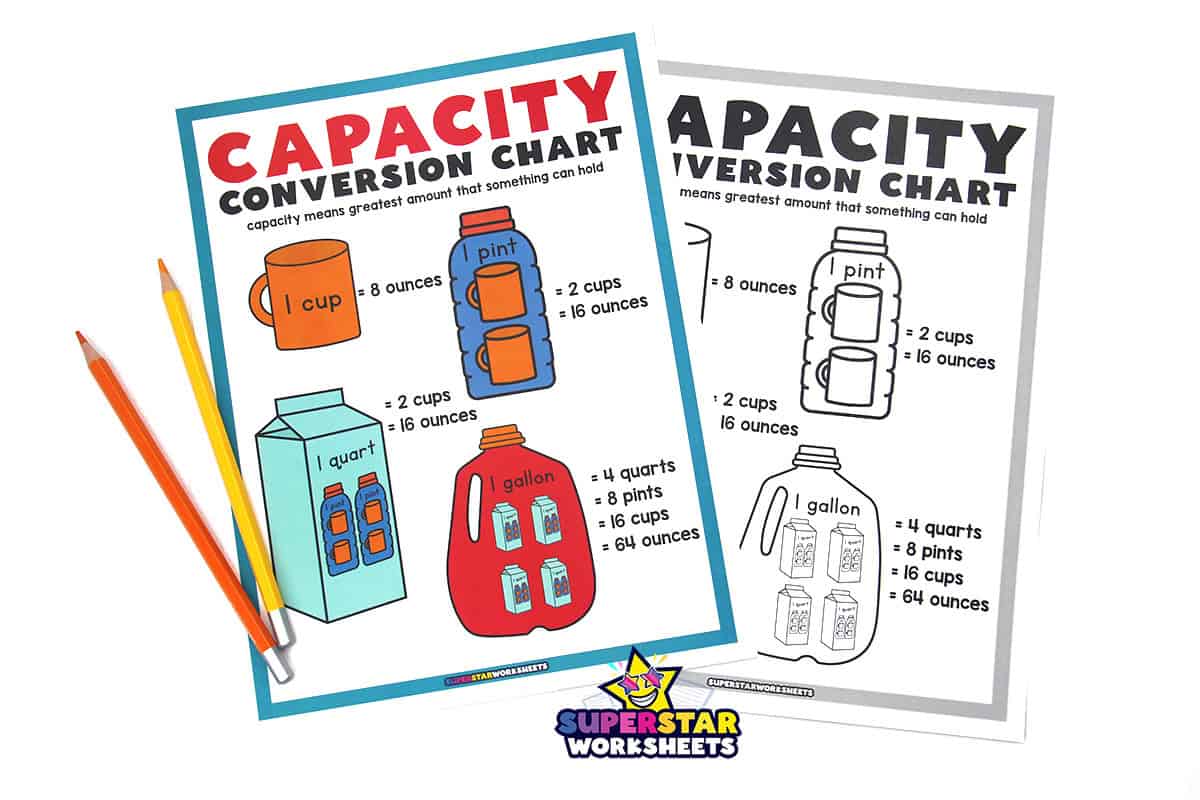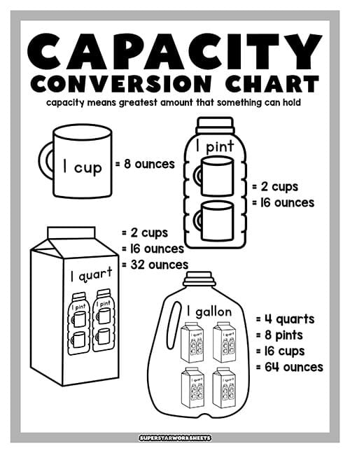 There are 128 ounces in a gallon, and our free capacity conversion chart makes it simple to see how ounces relate to cups, pints, quarts, and gallons all at once. Print it alongside your gallon man for a complete liquid measurement reference students can keep at their desks. Looking for a fun song to help your students learn about Mr. Gallon? Check out this video here.