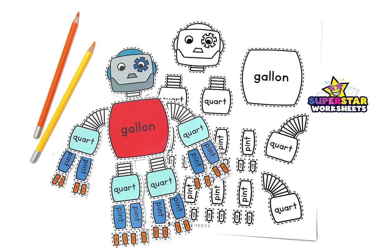 Free printable gallon man craft to assemble for kids. First, students color each section of the gallon man (cups, pints, quarts, and gallon). Second, students will cut out each body part carefully on the dotted lines. Finally, using a glue stick, students can assemble the cute robot. This makes for a memorable math lesson in your classroom.