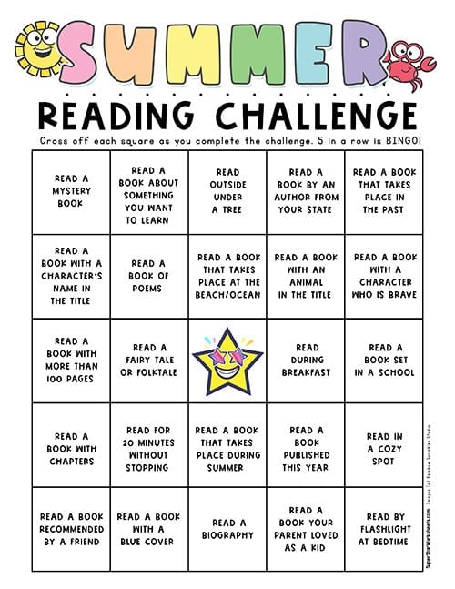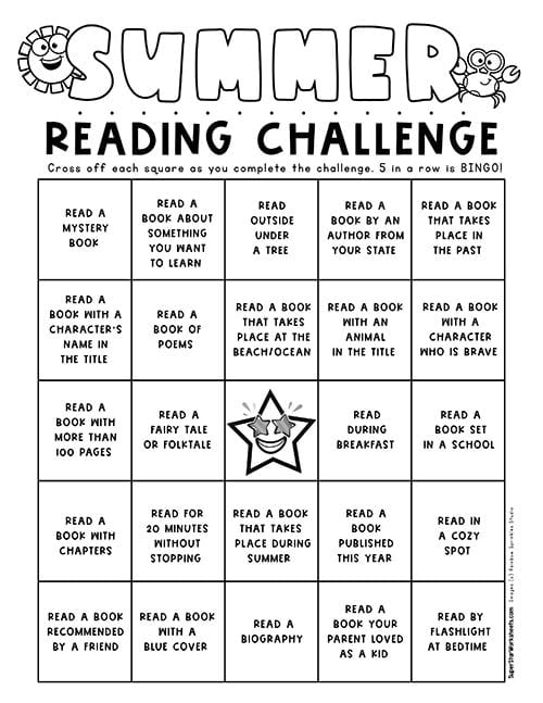 The black and white version of this reading log summer challenge lets kids color in the graphics and personalize their board before they start checking off squares. Great for artsy kids who like making things their own!