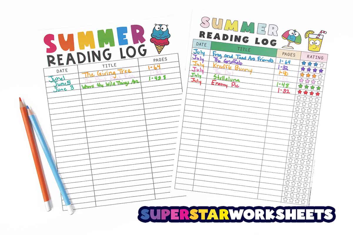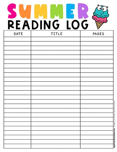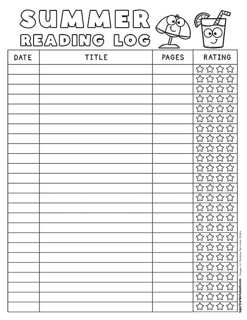 These summer reading challenges track date, title, pages, and rating with fun summer graphics at the top – the simple summer reading log format makes it easy for kids to record their progress all break long.