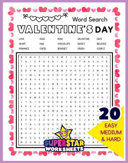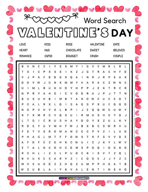 This Valentine’s Day word search includes 30 love-themed words for students to find. Our Valentine’s Day word search printable features seasonal vocabulary in a colorful grid. Use this Valentine’s Day Word Search for February classroom parties or homework packets.