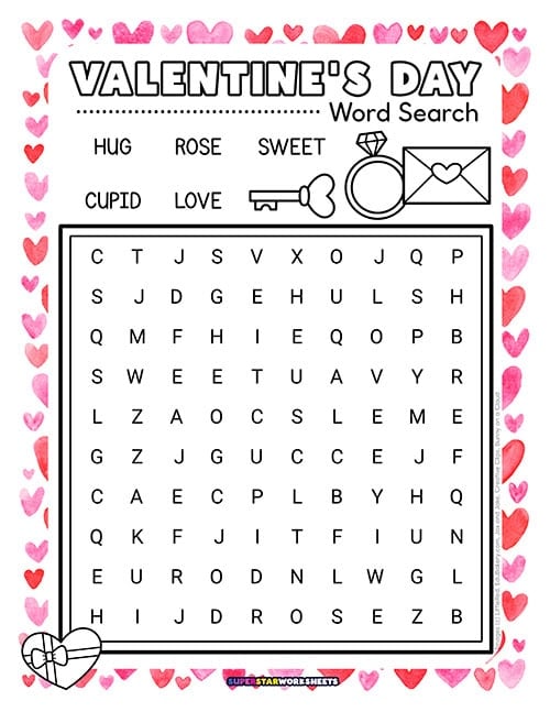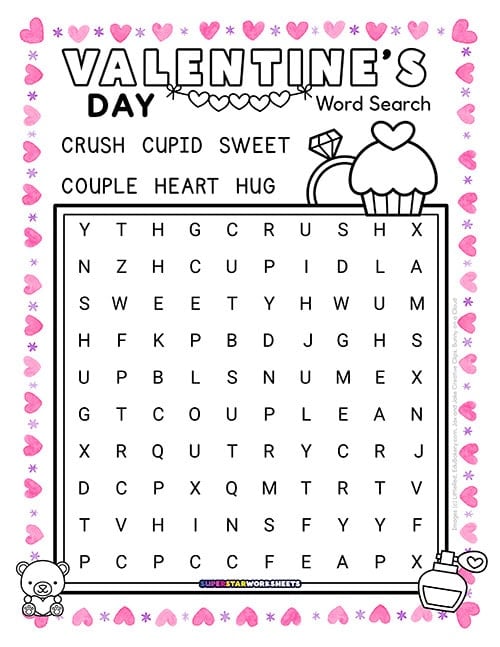Parents and teachers! You can laminate this Valentine’s Day word search for reusable learning centers. Our Valentine’s Day word search printable includes 6 love-themed words like crush, cupid, and heart that students circle with dry-erase markers.