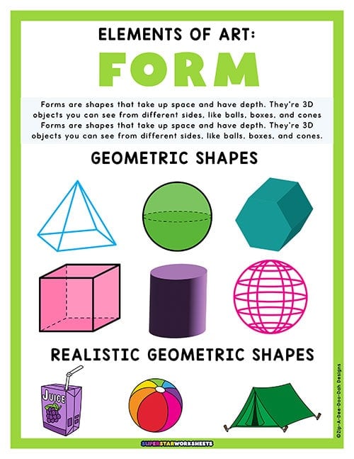 Free printable Elements of Art resources for kids! From elementary classrooms to high school studios, this collection of free printable art resources provides classrooms and homeschool families with colorful posters, interactive worksheets, and visual examples. Designed to teach the definition of art principles such as line, shape, form, space, value, texture, and color through hands-on activities, there’s something for every artist.