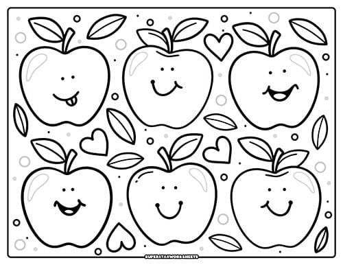 This is a cute apple coloring page with a leafy background. The apple has an adorable face with a cute little smile.