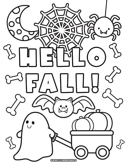 This fall coloring page is perfect for kids who love both autumn and Halloween! These free fall coloring pages feature cute spooky friends like a friendly ghost, bat, spider, and pumpkin wagon that make coloring pages fall fun and festive for the October season. Teachers! If you are needing more FREE fall-themed printables check out our Fall Worksheets today!