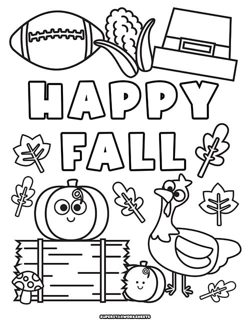These fall coloring pages for kids feature a festive “Happy Fall” scene with a football, pilgrim hat, turkey, pumpkins, and fall leaves perfect for celebrating the autumn season. Students can use this fall coloring page to practice fine motor skills while making these coloring pages fall favorites ideal for Thanksgiving activities and seasonal classroom fun.