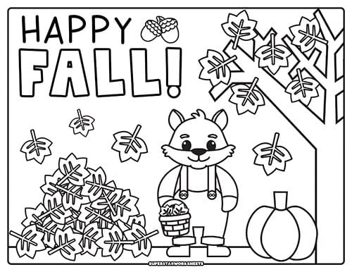 These free fall coloring pages feature an adorable squirrel raking fall leaves with a pumpkin and tree full of autumn foliage. Kids will love these fall coloring pages for kids showing the squirrel enjoying the season, making them perfect printable fall coloring pages for teaching about autumn activities and woodland animals.