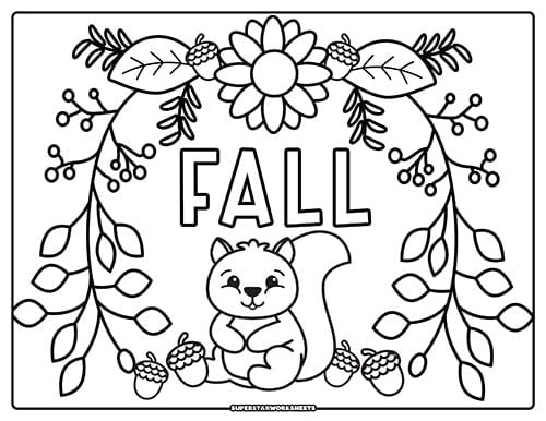 These free printable fall coloring pages showcase a cute squirrel surrounded by a beautiful autumn floral frame with sunflowers, acorns, leaves, and berries. Your students will enjoy these fall coloring pages printable designs that include adorable woodland animals as seasonal crafts and classroom decorations. Needing more worksheets for the fall? Try these FREE Fall Writing Prompts!
