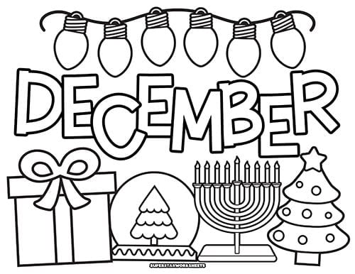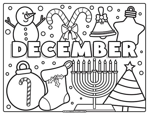These December Color Pages include a variety of winter holiday symbols and winter decorations arranged around the word “DECEMBER” in large block letters. Children will have lots to color here!
