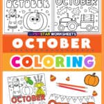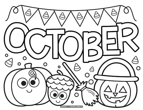 This printable October coloring page has a harvest party theme with with the name of the month “October” for kids to color in. The scene is filled with cute pumpkins, acorns, jack-o-lanterns, and tons of delicious candy corn! Your students will be delighted to color in this sheet.
