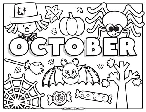 Free printable October Coloring Pages! Download and print fall favorites likes October pumpkins, acorns, spiders, scarecrows and more. Our simple, bold and easy Oct. coloring sheets are great for kids, teens, and adults to color in. Break out the warm fall colors and bring these beautiful PDF coloring sheets to life!