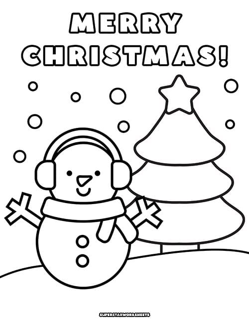 Celebrate the holiday season with this free printable Merry Christmas coloring page featuring a snowman with winter earmuffs in front of a Christmas Tree.