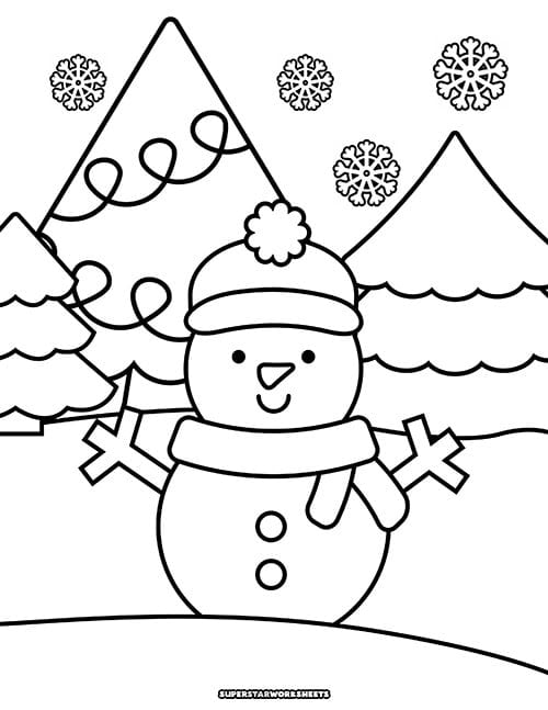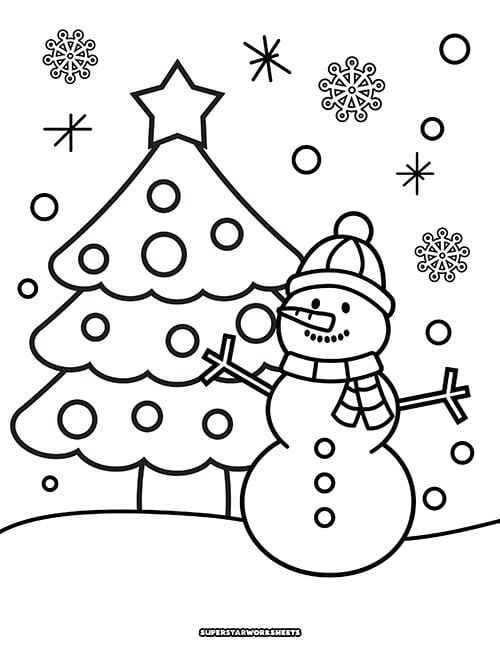 This winter snowman is standing in front of a Christmas tree filled with holiday lights, and amidst a snowflake blizzard. Use simple colored pencils, or markers for cute and cozy winter coloring. If your students love coloring in snowflakes, be sure to check out these large simple snowflake coloring sheets.