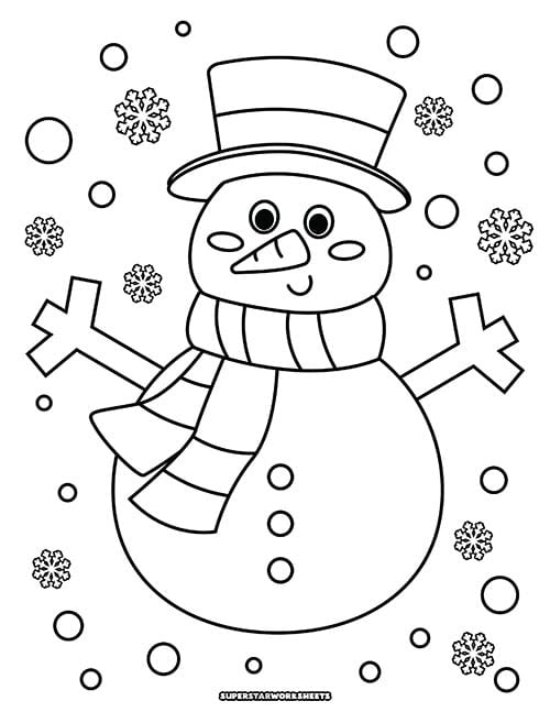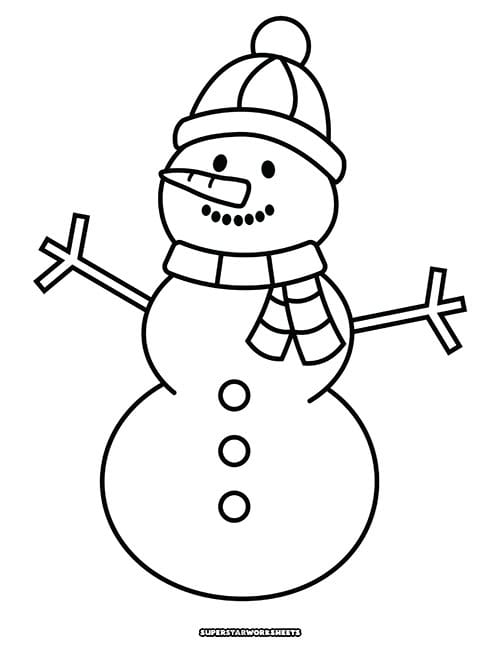 Free printable snowman coloring page for kids. Download and print this large pdf coloring page of a snowman with a winter hat and scarf. Bold and easy snowman coloring page for preschool and kindergarten students to color in.