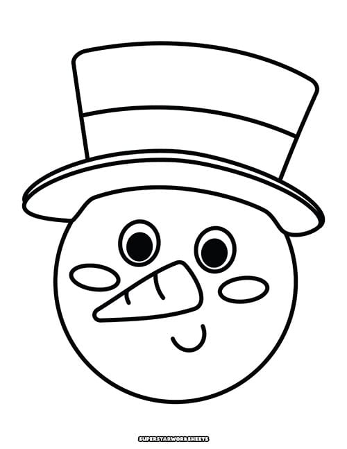 Simple and Easy snowman coloring page for tots, and preschoolers to color in. Thick black outlines of a snowman face with a top hat and carrot nose. This pdf coloring sheet is extra large for little hands to color.