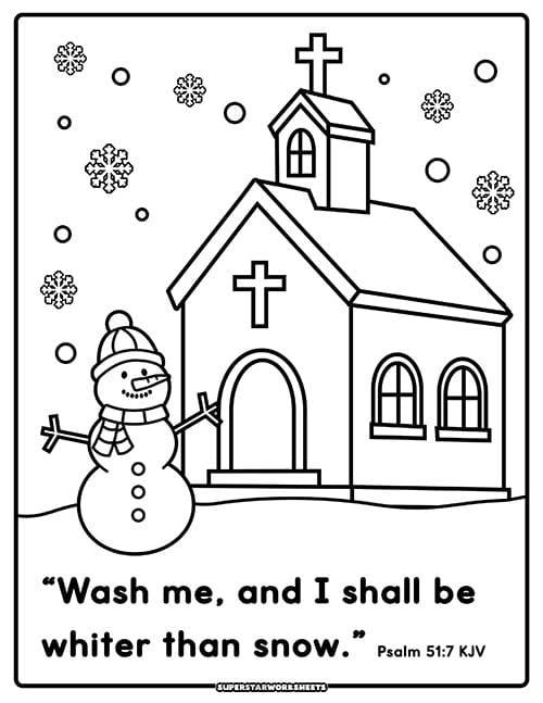 Here is a simple snowman bible verse coloring page for Sunday School and children’s ministry. The verse from Psalm 51:7 reads, “Wash me, and I shall be whiter than snow,” and features a snowman in front of a beautiful church. More Bible Verse Printable Coloring Sheets here.