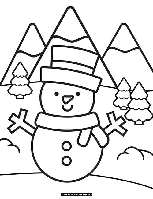 This snowman is dressed in winter gear including a pom-winter hat and scarf. Pine and fir trees in the background with falling snowflakes give this coloring page a woodsy winter vibe. Find more easy snowmen templates and blank outlines of snowmen here.