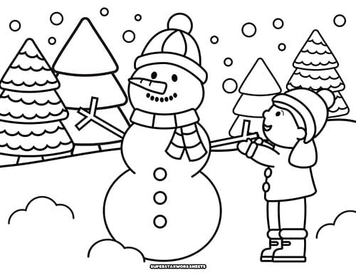 Students can color in this picture of a young child making a snowman in the woods! This happy snowman has the classic carrot nose, and a happy coal smile.