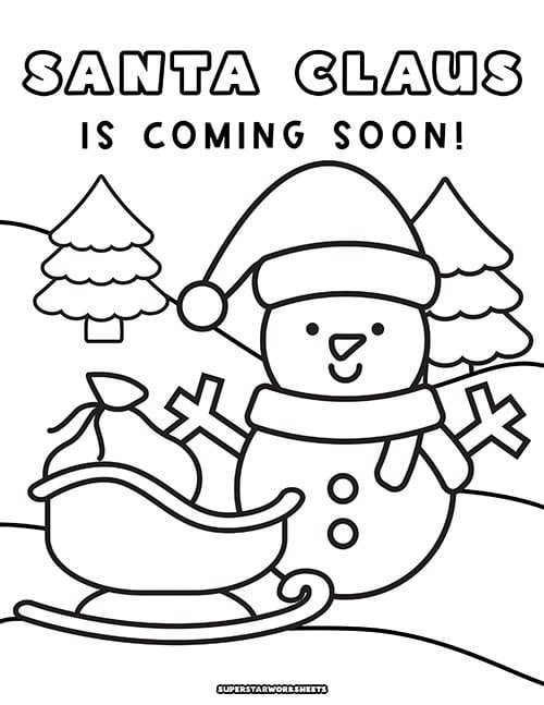 Santa Claus is coming to town! This Snowman coloring sheet features a cute little snowman adorned with a Santa hat and has a sleigh full of Christmas presents to deliver to the girls and boys!