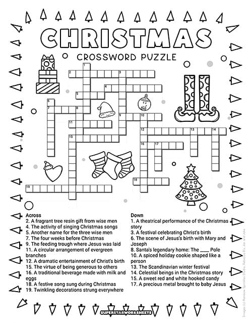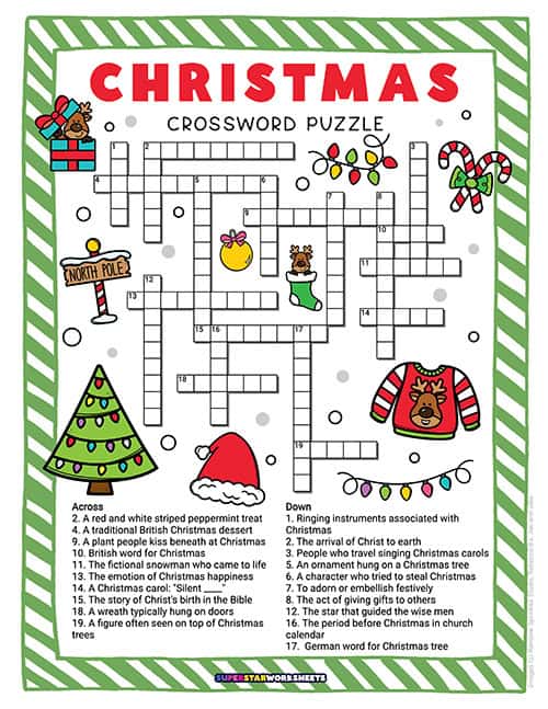 This hard free printable Christmas crossword puzzles printable features 19 clues covering deep Christmas vocabulary and traditions – a rewarding Christmas crossword puzzle for adults and older students who love a serious holiday challenge!