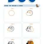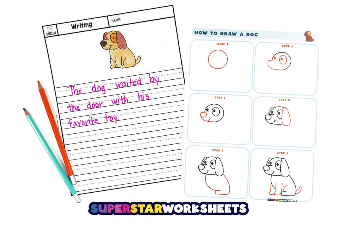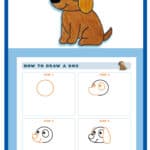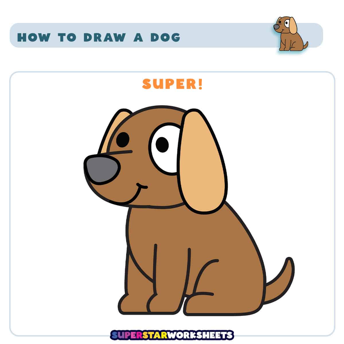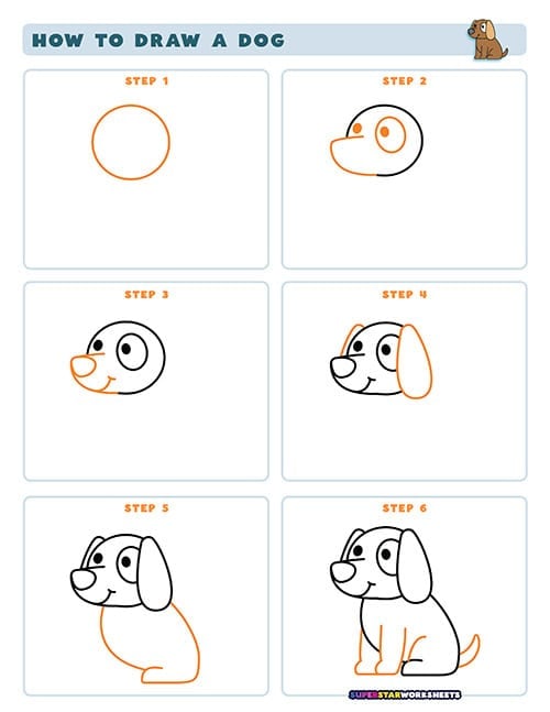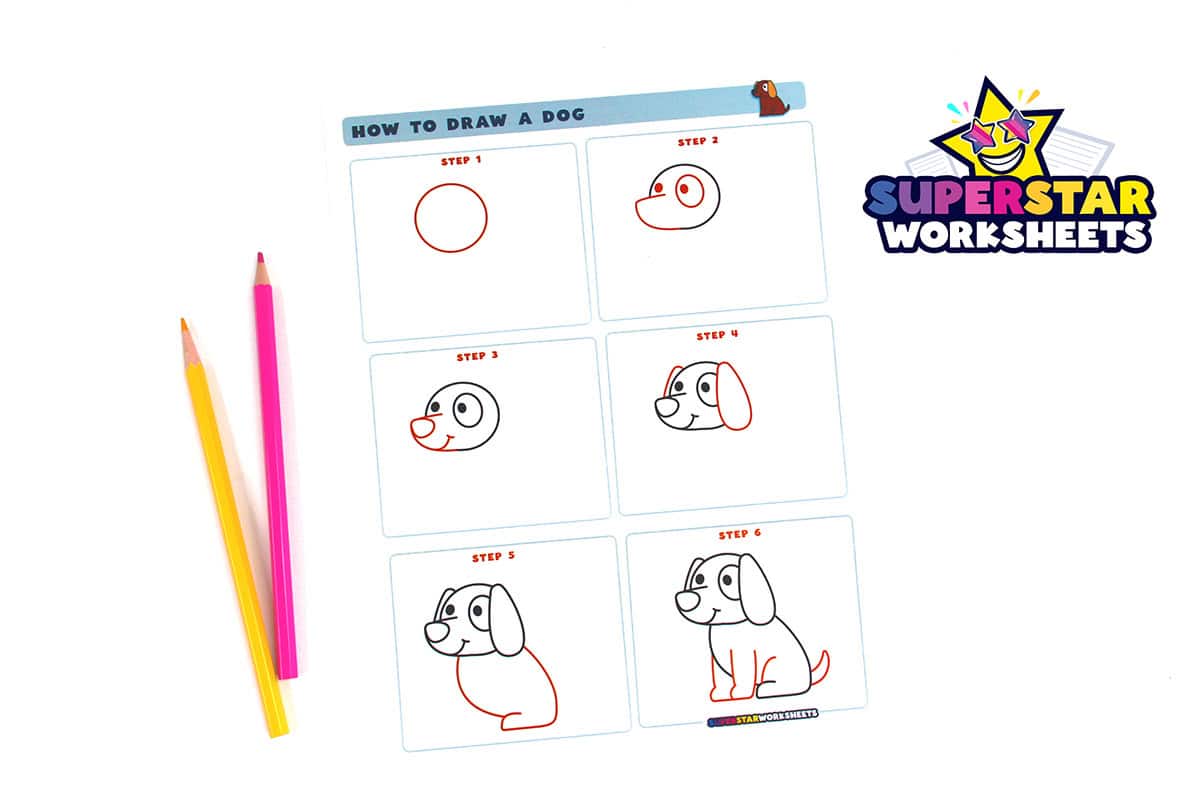 This step-by-step dog drawing tutorial will help your students create their own adorable puppy in 6 easy steps! Featuring simple black outline drawings and illustrations, our dog drawing guide is quick and easy for beginners. Download and print our directed drawing worksheets or follow the full drawing tutorial below.