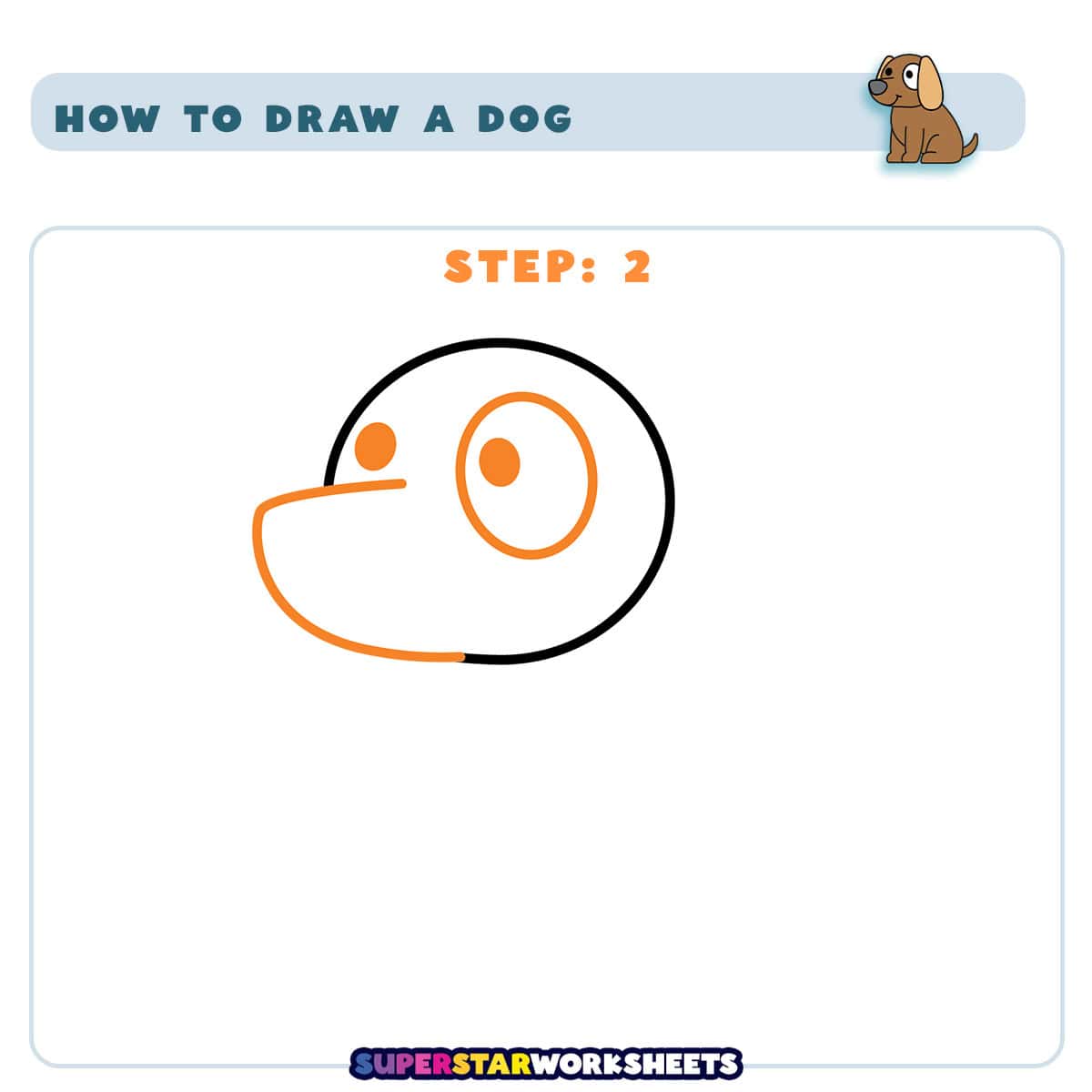 Now, let’s add the ears and eyes! Draw two small circles inside the head for the eyes, positioning them toward the right side. Then add a floppy ear on the left side using a curved shape. This gives our puppy that adorable, friendly look!