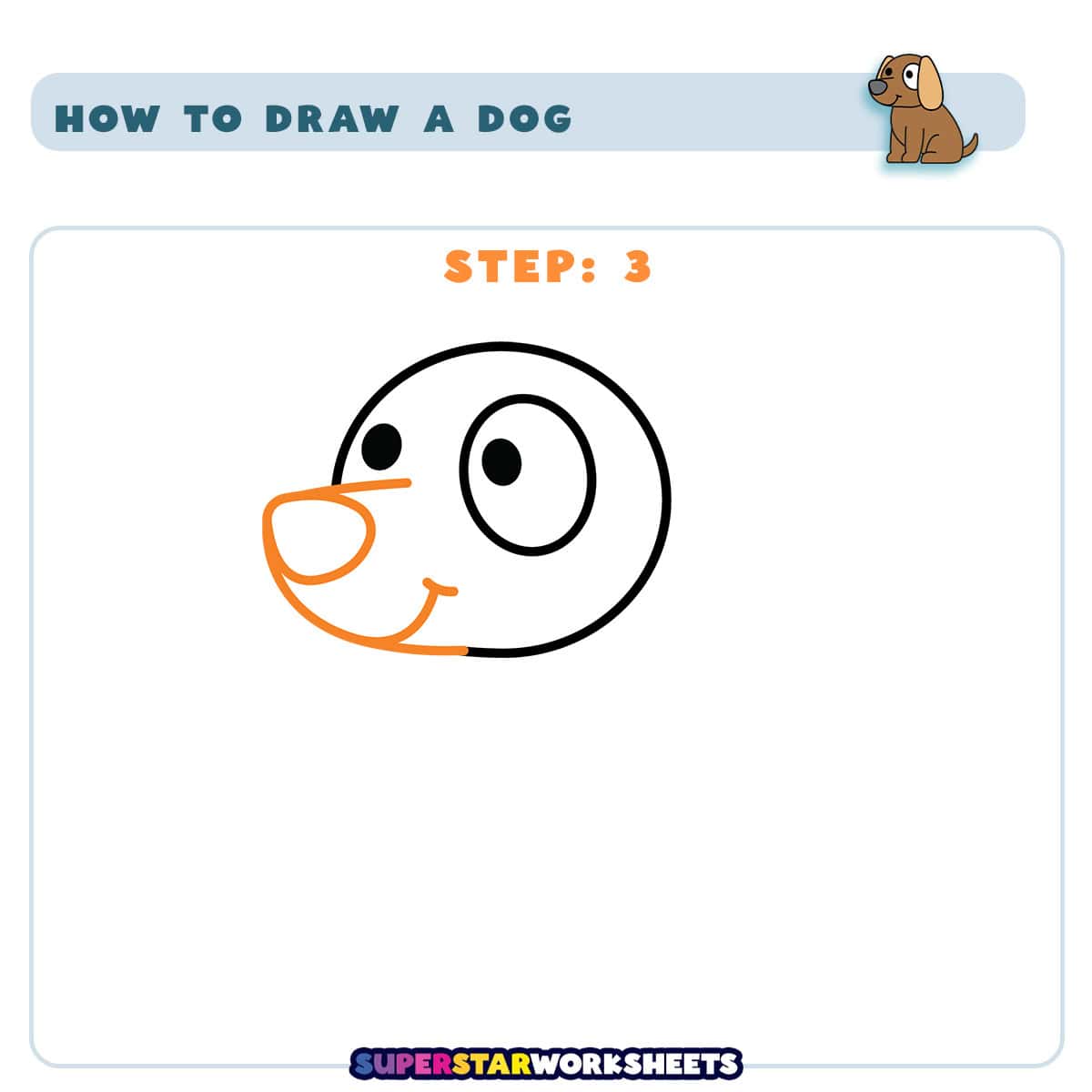 Time to add the snout and facial details! Draw a small curved shape on the left side of the face for the nose and mouth area. Add in the pupils to the eyes and a cute smile. Your dog is really starting to come to life now!