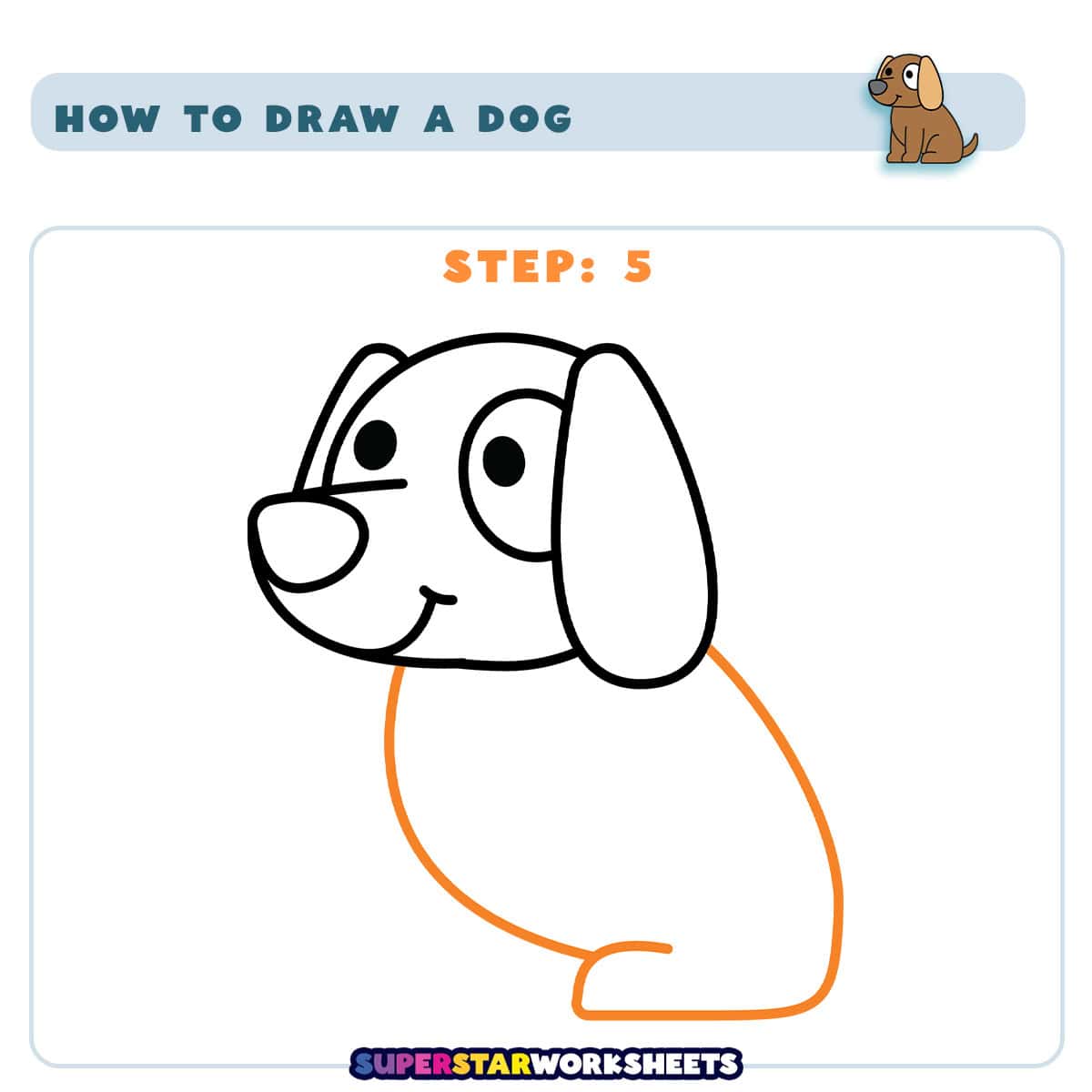 Time to draw the body! Add a curved oval shape below the head for the dog’s body. This gives your puppy a cute, sitting position. Make sure the body connects smoothly to the head and is proportional – not too big or too small compared to the head size.