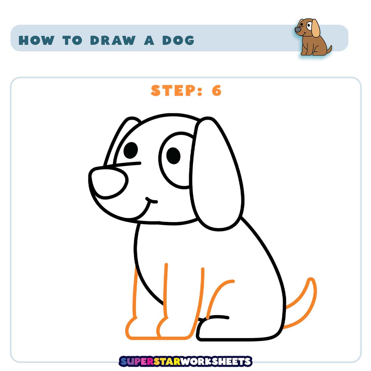 Finally, let’s add the legs and tail to complete our dog! Draw two front legs at the bottom of the body, adding small lines to show the paws. Then add a cute curved tail on the right side. Your adorable puppy drawing is now complete! You can color it in any pattern you like – spots, solid colors, or even make it look like your own pet!