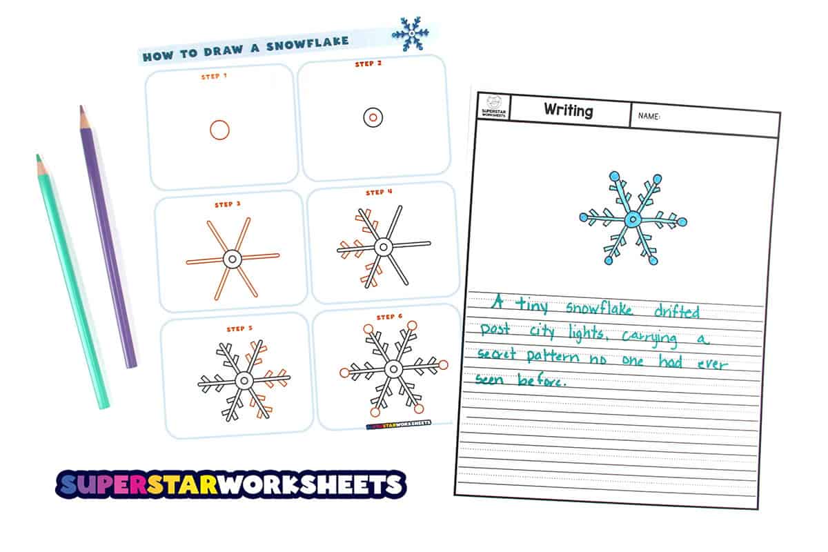 How to draw a simple and easy snowflake for kids. This step-by-step snowflake drawing tutorial will help your students create their own beautiful winter snowflake in 6 easy steps! Featuring simple black outline drawings and illustrations, our snowflake drawing guide is quick and easy for beginners. Download our printable directed drawing worksheet or follow the full drawing tutorial below. If you are needing more drawing printables for your students try out our Directed Drawing Bundle today!