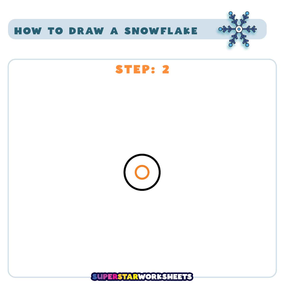Now, let’s add another circle around the first one, creating a ring shape. Draw a larger circle that surrounds your center circle, leaving some space between them. This double-circle design will serve as the center point where all of your snowflake’s arms will connect in the next steps!