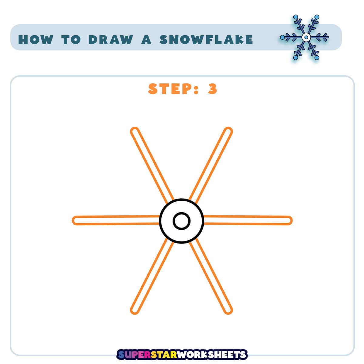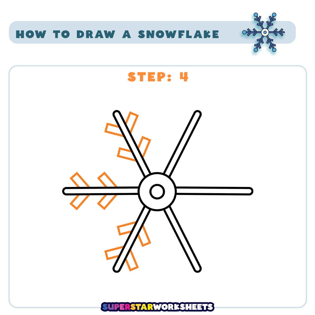 Now let’s add smaller branches to make your snowflake look more detailed! On two of the main arms, draw small diagonal lines pointing outward, like tiny branches on a tree. Add 2-3 small lines on each side of these arms. Space them out evenly as you move from the center toward the tips.
