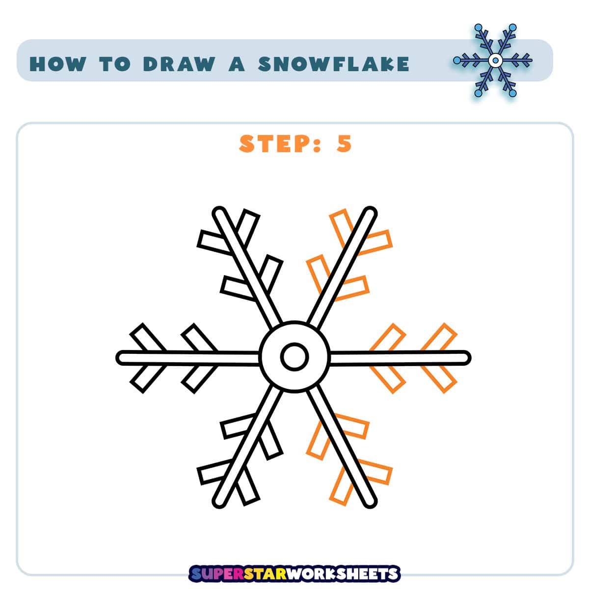 Keep adding more branches! Now add the same small diagonal lines to the rest of your snowflake’s arms. Make sure each arm has the same pattern of branches so your snowflake looks symmetrical and balanced. Remember, snowflakes in nature are always symmetrical, so try to make all six arms match!