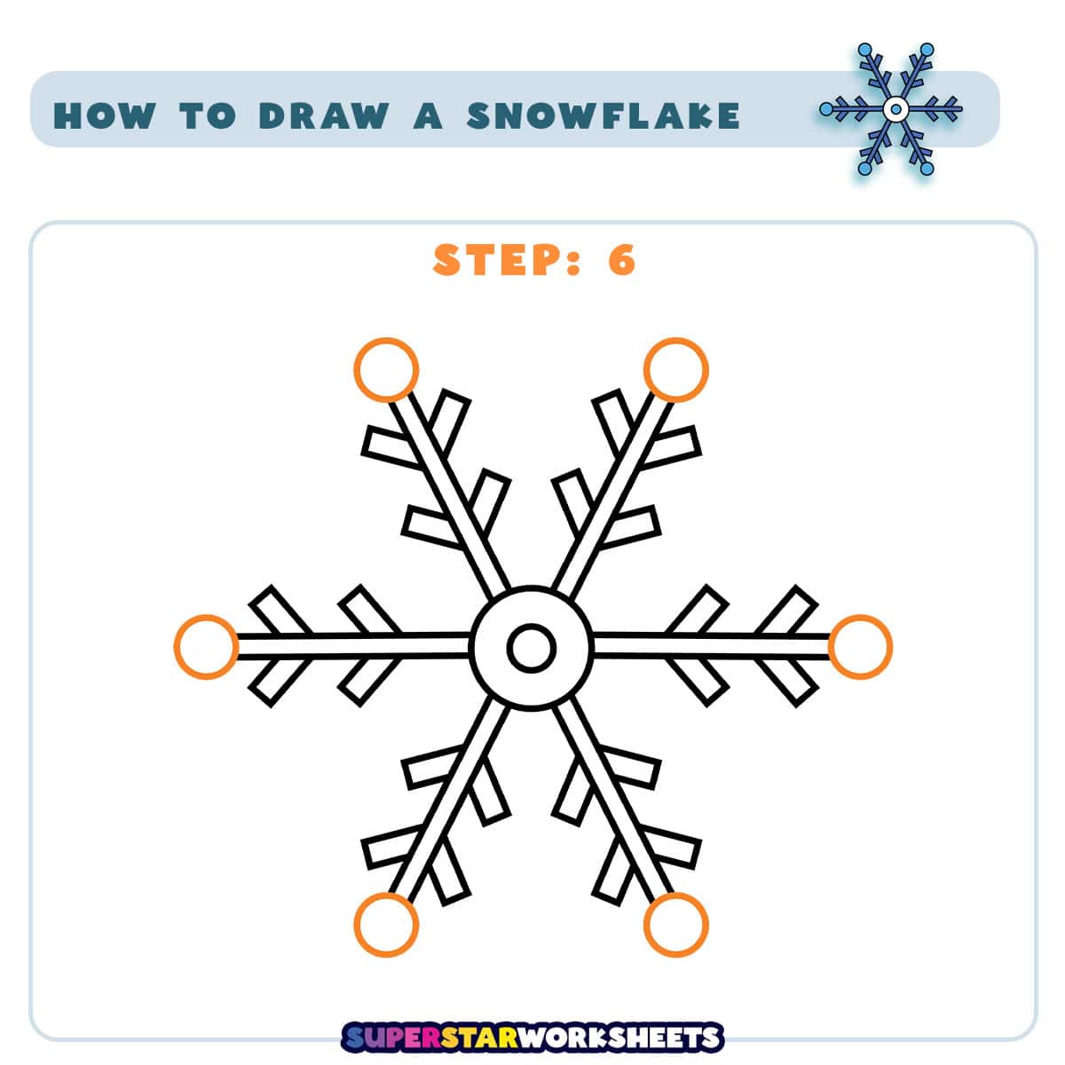 Finally, let’s add some finishing touches to make your snowflake sparkle! Draw small circles at the end of each main arm. You can also add tiny circles at the tips of some of the smaller branches if you want. These little details make your snowflake look complete and beautiful. Now your snowflake drawing is finished!