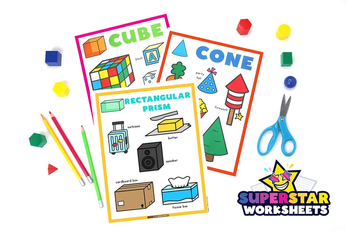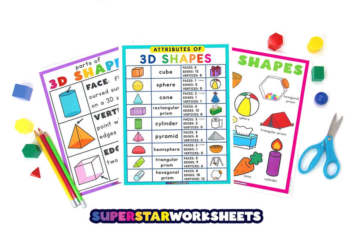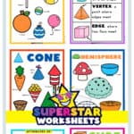 3D Shapes Charts are free, printable anchor charts! Designed specifically for use in kindergarten, first-grade, and second-grade classroom environments. These worksheets feature realistic designs, including cones, pyramids, rectangular prisms, and more! Students learn to describe the shapes using vocabulary words like face, vertices, and edges. These 3D Shape Charts PDF worksheets pair well with our Interactive Math Curriculum, giving students daily lessons on a variety of primary math topics.
