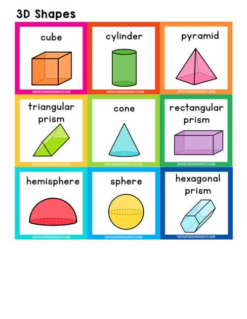 Teachers! To make your FREE 3D shape printables last longer just laminate after printing and before cutting out. This small step will save you time and money! With our 3D shape activities students will also learn spatial awareness in terms of geometry. Teachers if you need more FREE shape activities try our 2D Shapes Chart today.