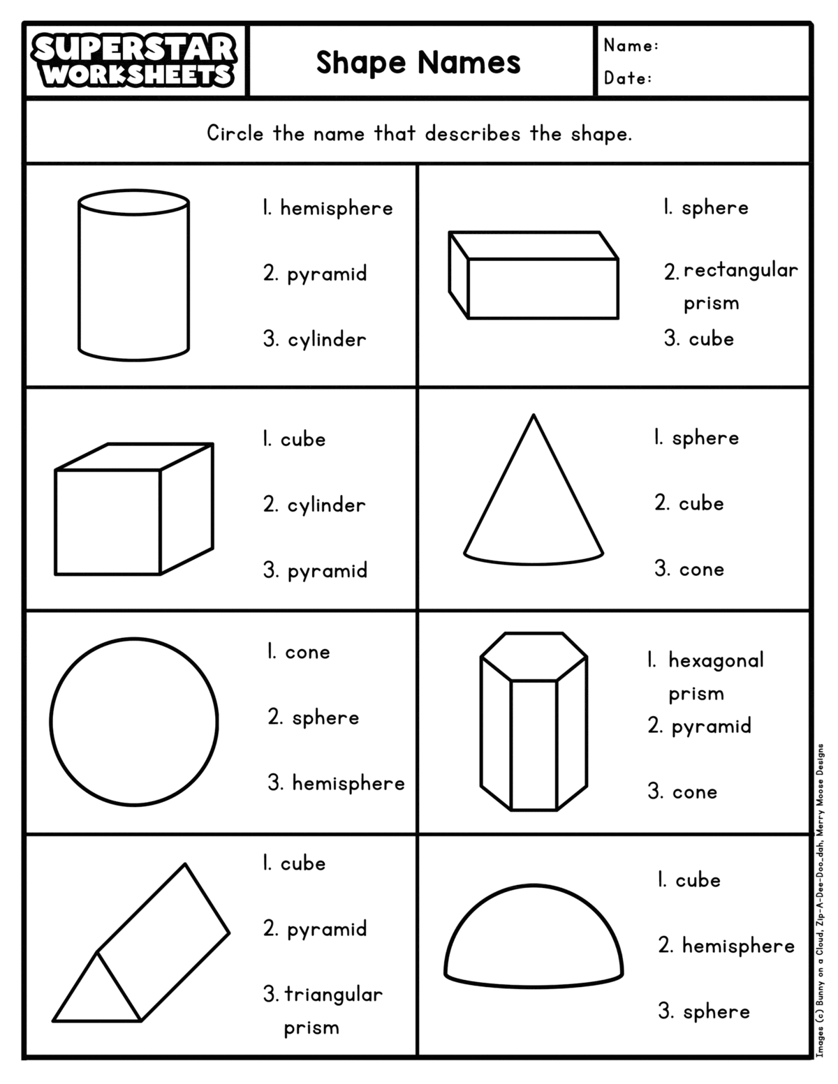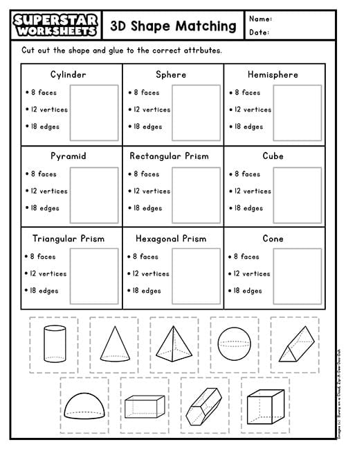 3D Shape Worksheets for free! Our 3D Shape Worksheet PDFs contain games, activities, tracing, and coloring pages for primary students in grades k, 1, and 2. Students practice geometry skills hands-on using three-dimensional shape recognition and creation. With over 20 pages of printable PDF worksheets, our low-prep shape activities coordinate perfectly with our Fine Motor Shape Bundle.