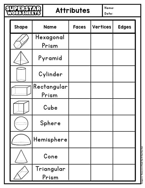 How many faces, vertices, and edges does each three-dimensional shape have? Your students will find out using this shape attributes worksheet.