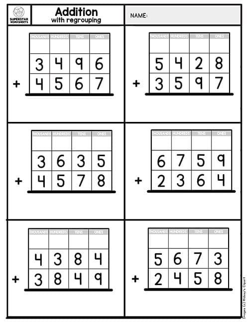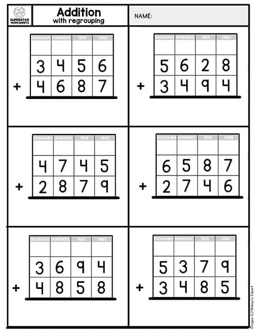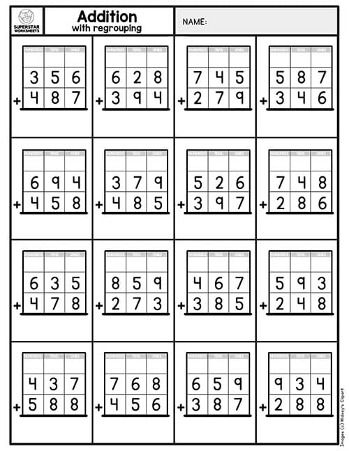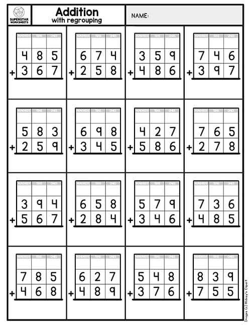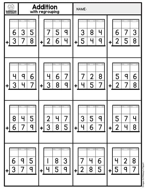 Free printable addition with regrouping worksheets. These free math worksheets will help your students learn how to regroup with strategic place-value grids as a guide.