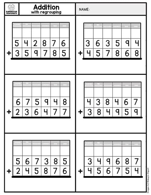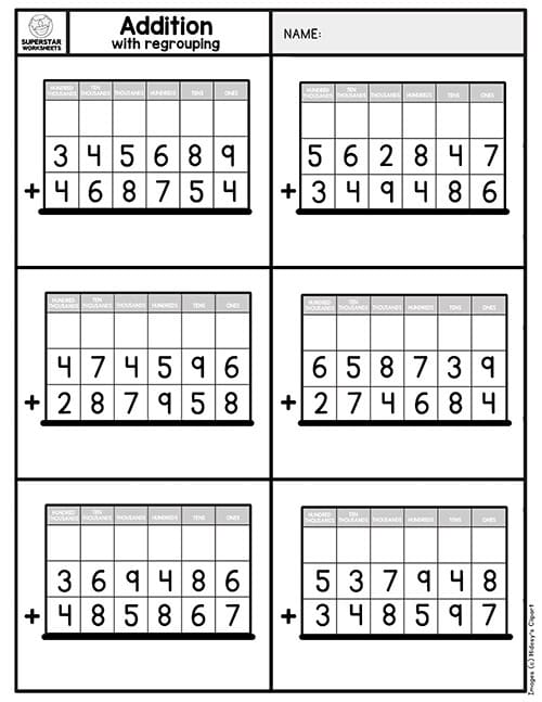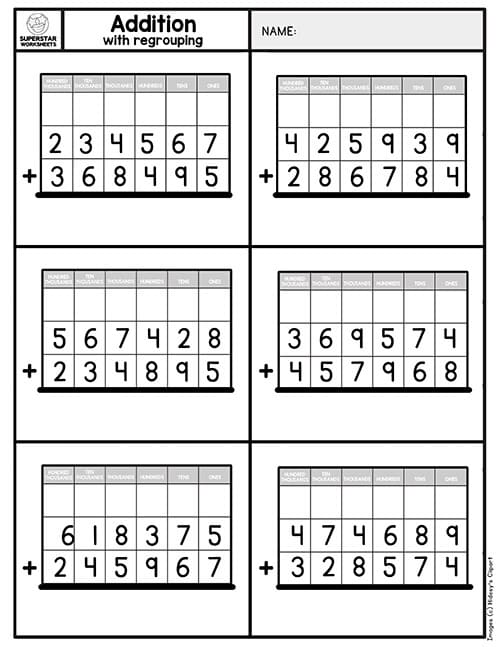 Show mastery of regrouping techniques with these complex six-digit addition problems. This resource provides appropriately challenging content for upper elementary learners who need practice with advanced addition.