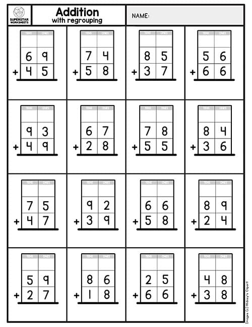Designed specifically for Grade 1-2 learners mastering place value concepts, these free two-digit with regrouping worksheets include problems to help students visualize the process of regrouping addends with precision.