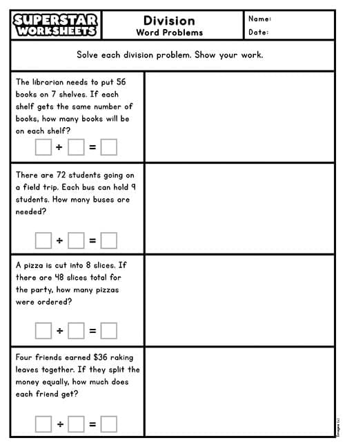 Free printable division word problems worksheets makes learning fun and effective for elementary students. Our division word problems are perfect for math practice with grade 3, grade 4, and grade 5 resources. These math division exercises provide real-world scenarios in pdf printable format to help build critical thinking and problem-solving skills. Each worksheet is available as a free download, ready to print and use in your classroom today!