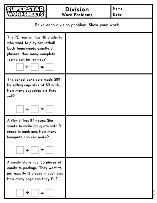 Division Word Problems Math Sheets