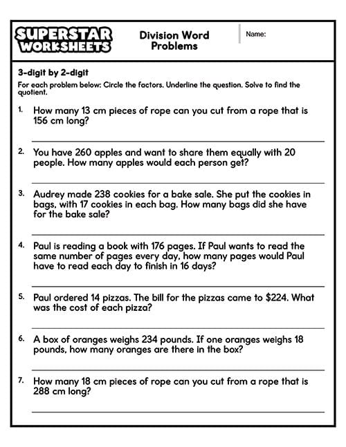 Our 3 digit by 2 digit division word problems give students more intermediate practice on how to divide using our pdf division word problem worksheets.