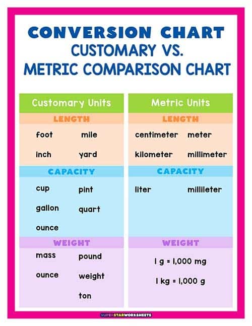 This printable is a handy conversion reference chart that covers both customary and metric units. Students get length conversions: foot, mile, inch, yard, centimeter, meter, kilometer, millimeter. Capacity measurements: cup, pint, gallon, quart, liter, milliliter. Weight units: mass, pound, ounce, weight, ton, grams, kilograms. All organized in an easy-to-read format for quick classroom use.