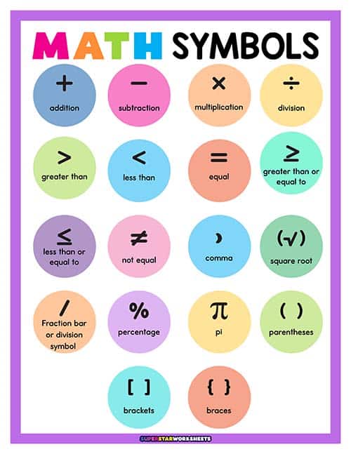 Math Symbols Charts are printables that help students master mathematical symbols and their meanings in grades K-5. These free resources address symbol definitions, mathematical operations, and problem-solving formulas that form the foundation for all elementary math concepts. These color filled math symbol charts are perfect for classroom display, individual reference, or hands-on practice.